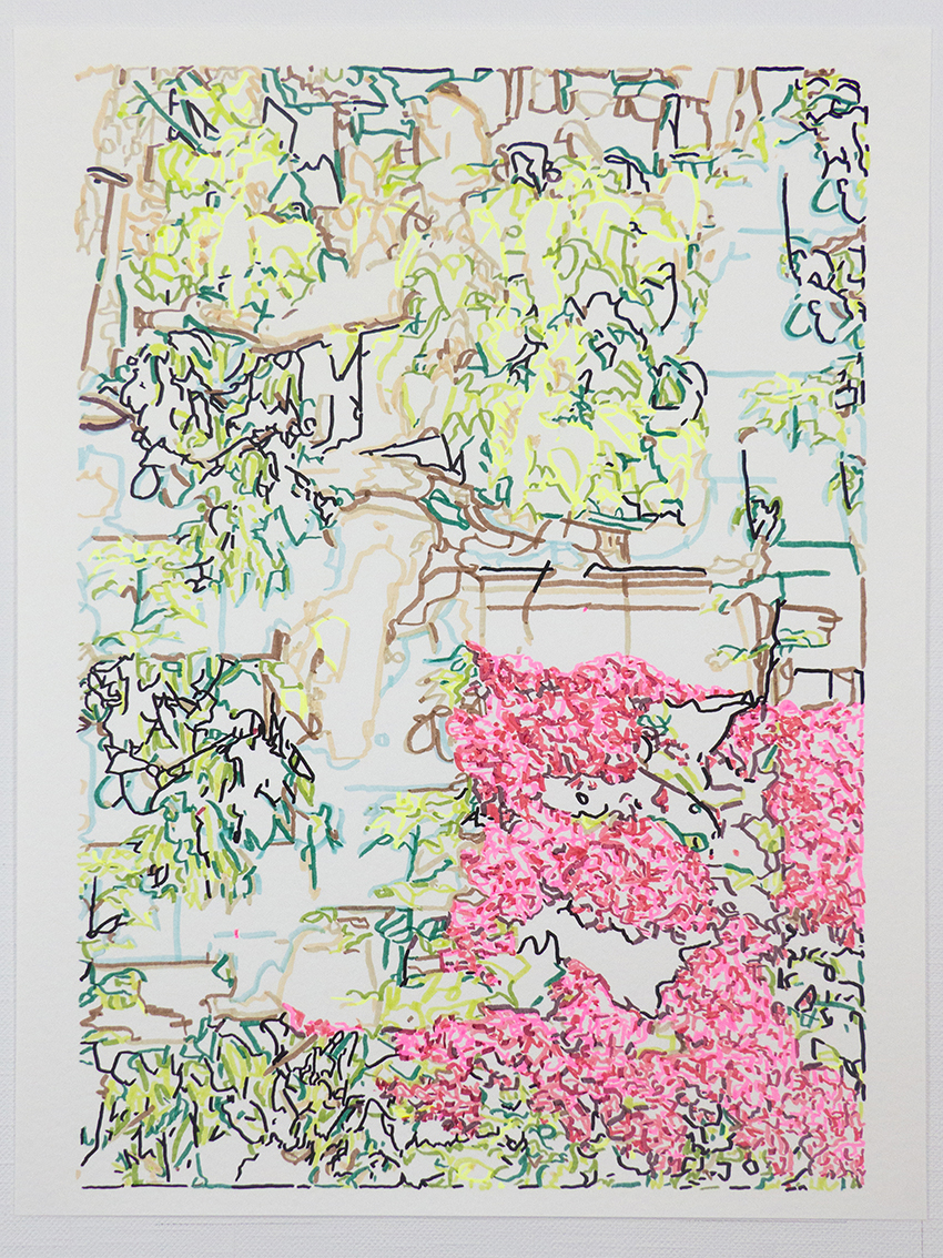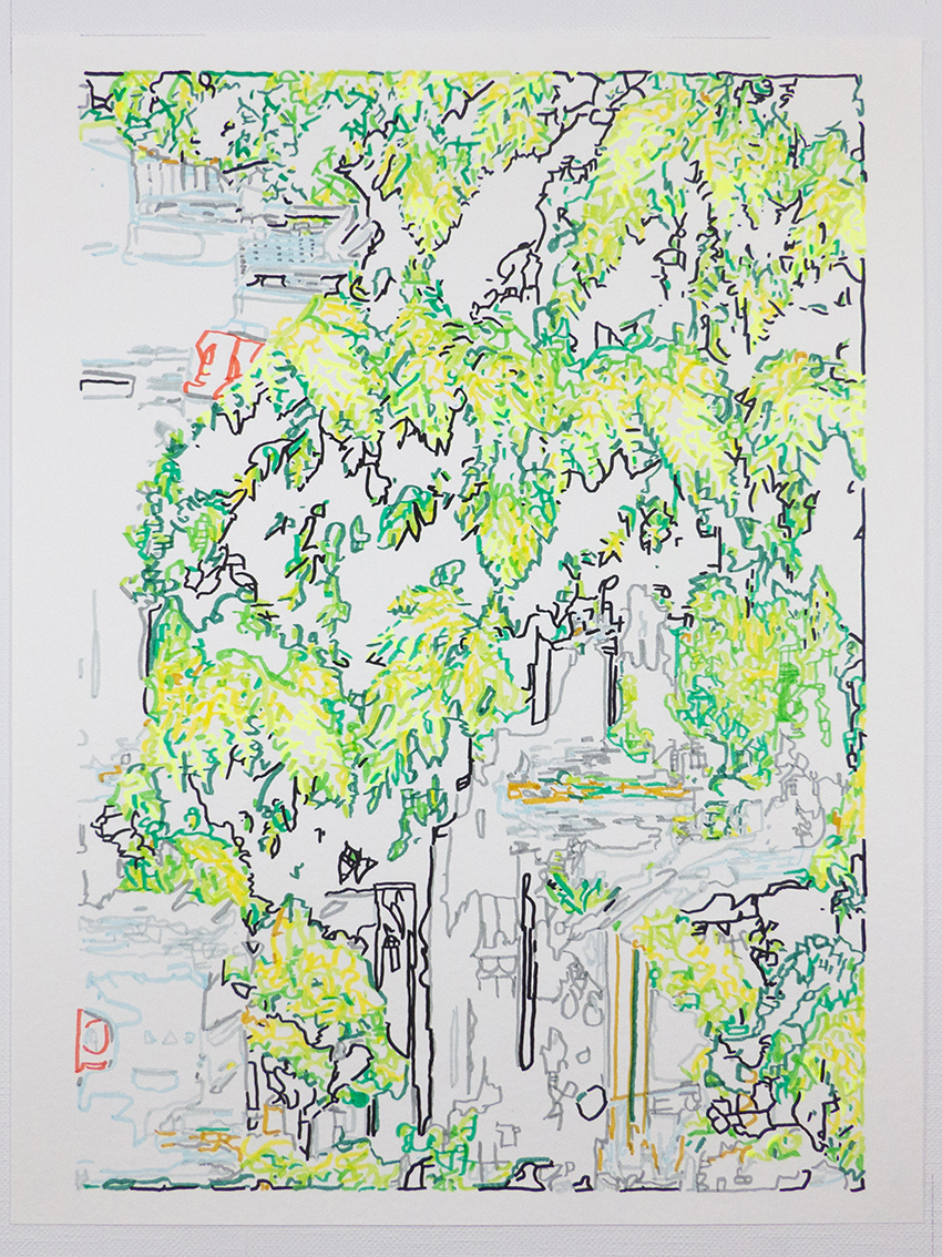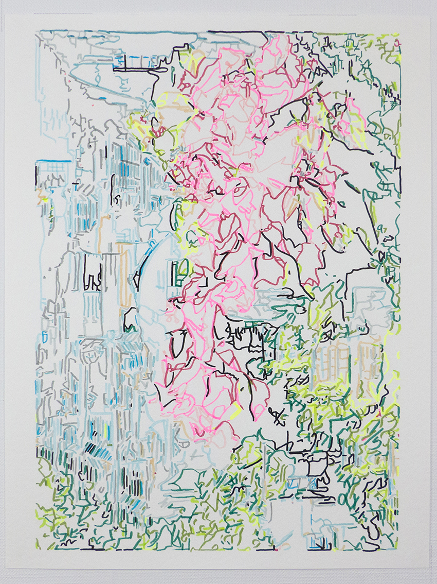 À partir d’ un travail photographique et de composition via Photoshop, des images sont transformée en vecteurs, lesquels sont reportés sur papier. La dimension très mécanique du process et la trace de l’ outils informatique s’ opposent au foisonnement visuel de lignes colorées d’ où l’ on se surprend à reconnaître des formes végétales familière où des signes. Le fluo accentue une forme de scripturalité, souligne des traits et l’exercice d’une main contrainte par une abstraction violente. L’ accumulation de ces tracés abstraits reconstruit une image, qui pourtant échappe encore au saisissement de quelque chose d’ identifiable.